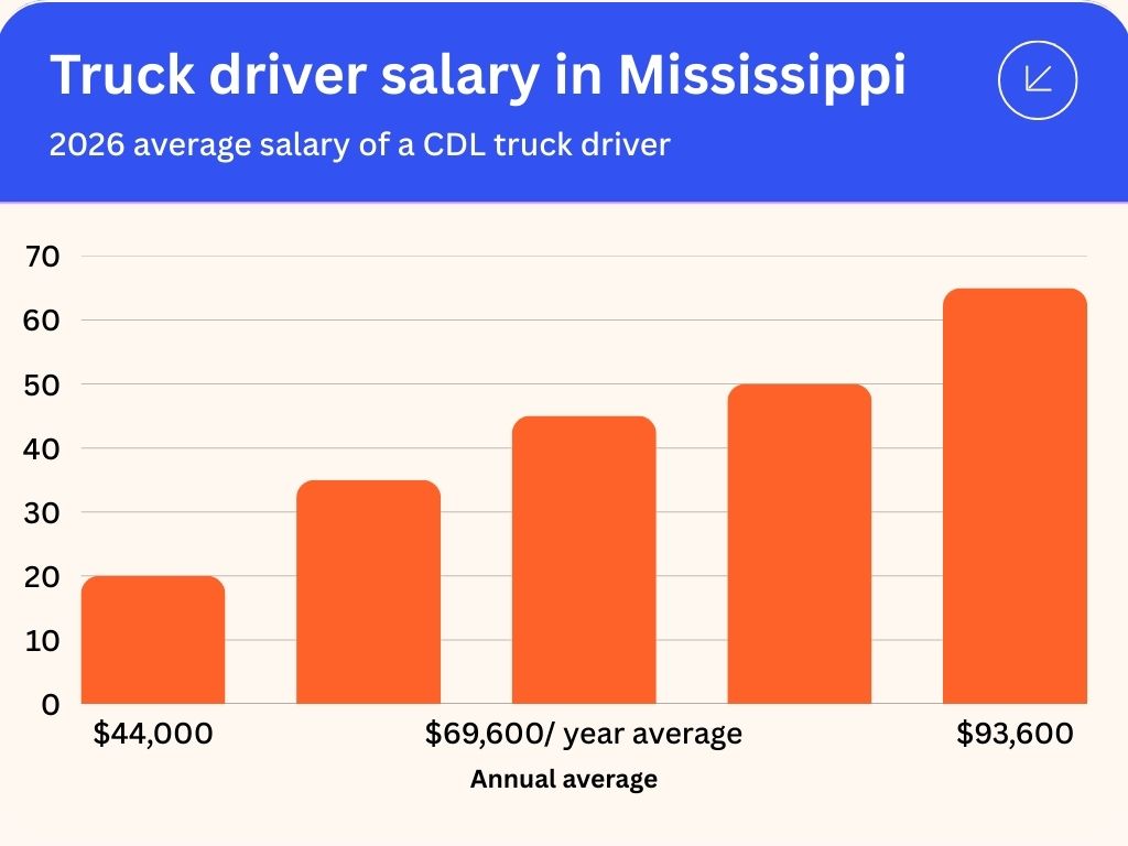 The average truck driver salary in Mississippi starts at $44000 for entry-level positions and reaches $69600 for experienced drivers, while specialized truck drivers and owner-operators can earn up to $93600 annually.